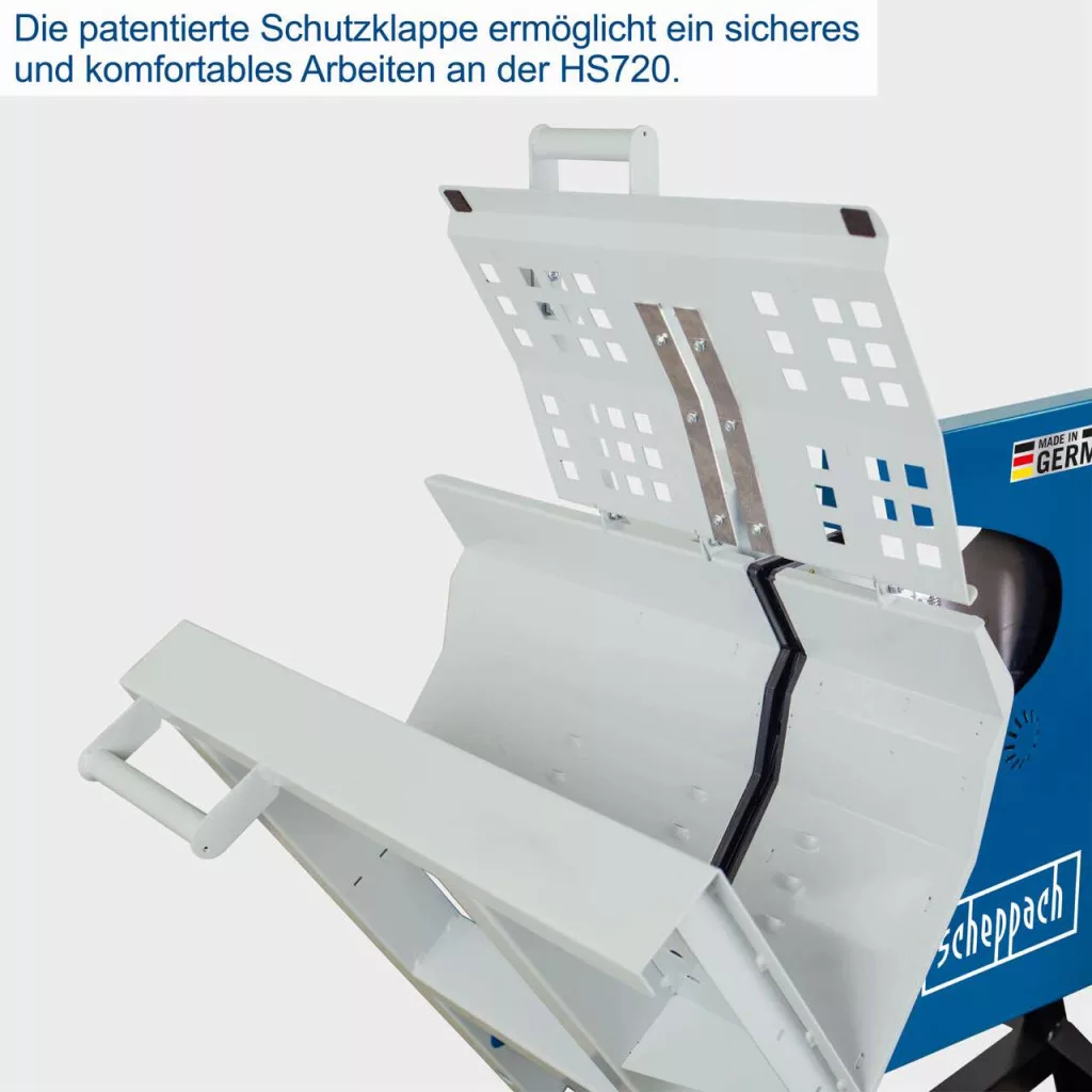 A behúzókeretet a szabadalmaztatott Scheppach biztonsági fedél fedi, amely megvédi a felhasználót a faszilánkoktól és a fűrészlappal való véletlen érintkezéstől. Nyitott fedél esetén a behúzókeret mechanikusan reteszelődik. A vágás csak akkor végezhető el, ha a biztonsági fedél teljesen zárva van. A fedél csak akkor nyitható ki, ha a behúzókeret nyugalmi helyzetben van.