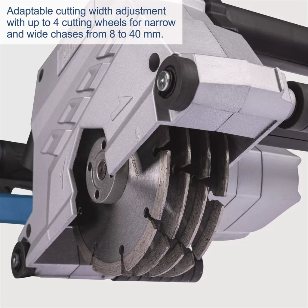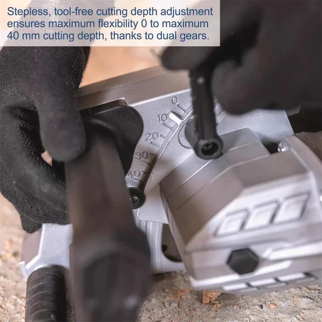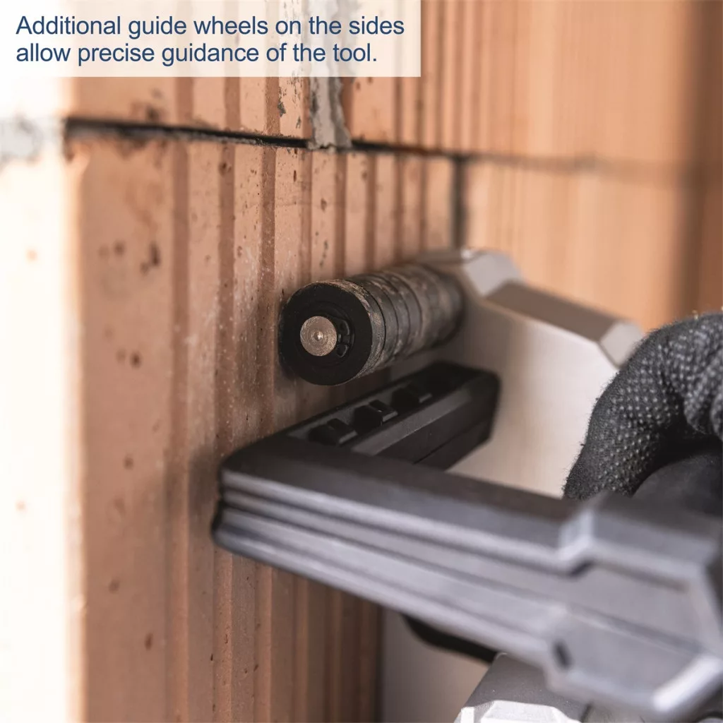 Az erőteljes, 2250 W-os bemenő teljesítményű és 5400 ford./perc fordulatszámú motorjának köszönhetően még az igényes feladatokkal is nagy hatásfokkal képes megbirkózni. A marógép 125 mm átmérőjű gyémánt tárcsákkal van felszerelve, amelyeknek még kemény anyagok sem jelentenek gondot. A szerszám nélküli, fokozatmentesen állítható vágásmélység-beállítás maximális rugalmasságot tesz lehetővé – a sekély hornyoktól a 40 mm-es mélységig. A kétfokozatú váltónak köszönhetően könnyen hozzáigazítható az erő a megfelelő horonymélységhez. Egy másik praktikus tulajdonsága az állítható vágási szélesség. Akár négy vágótárcsát is használhat egymás mellett, és 8-40 mm széles hornyokat hozhat létre, amelyek lehetővé teszik a szerszám különböző típusú feladatokhoz való igazítását. A tengelyzárnak köszönhetően a tárcsacsere gyors és egyszerű. A 4 (vékonyra vágott) tárcsának köszönhetően szélesebb hornyokban nagyon könnyen tisztítható a horony belsejében maradó törmelék. A lágyindítás funkció fokozatos motorindítást biztosít, ami csökkenti a kopást és védi a készüléket a túlterheléstől. Az elektronika nagy terhelés mellett is állandó teljesítményt tart fenn, így a gép minden körülmények között megbízhatóan működik. A 4 méteres kábelnek köszönhetően nagy hatótávolságot, és így bőséges szabad mozgást biztosít a munka során. Az oldalsó vezetőgörgők lehetővé teszik a szerszám pontos vezetését a felületen, ami növeli a munka pontosságát és minőségét. Az ergonomikus és kompakt kialakítás puhított markolatfelülettel és a kétkezes kezelési lehetőséggel biztosítja a kényelmes munkavégzést hosszabb használat során is. A tisztább munkakörnyezet érdekében a gép könnyen csatlakoztatható egy külső porelszívóhoz.