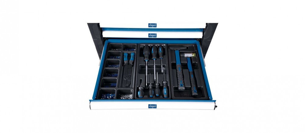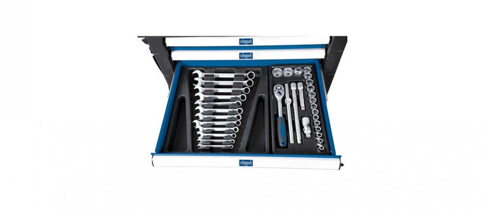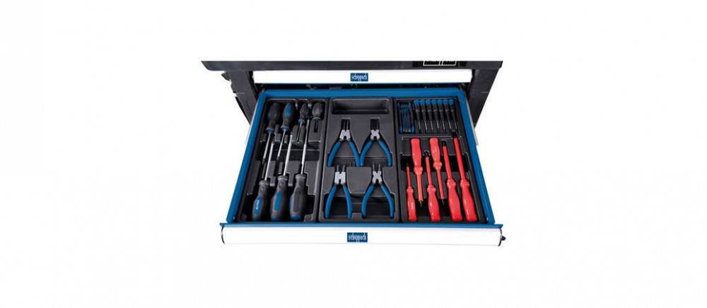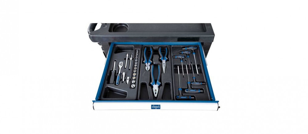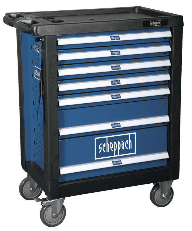 A Scheppach TW 1000 egy professzionális, teljesen fém műhelykocsi, amely alkalmas mind az otthoni, mind pedig iparosi műhelyekbe, garázsokba, szervizekbe stb. Előnyei közé tartozik a masszív szerkezet, a keményített műanyag burkolatú sarkak és élek, az apróbb dolgok elhelyezésére szolgáló mélyedésekkel kialakított masszív műanyag munkaasztal, melynek oldalai mindig a helyén tartják a szerszámait. A könnyű kezelhetőséget a két puhított markolat és a négy nagy kerék biztosítja. Ezek gumírozottak, melyből kettő, fékkel ellátott bolygókerék. A csúcsminőség a fiókok könnyű manipulációjánál is tapasztalható. Ezek nagyon robusztus csúszó vasalatokkal vannak ellátva, így könnyen mozgathatók még teljes súlyterhelésnél is. Természetesen az önnyítódás elleni szerkezettel és zárral is rendelkeznek. Az oldalfalak lyukacsos lemezből lettek kialakítva, ami remek lehetőséget biztosít további szerszámok, tartók, vagy akár polcok rögzítésére is. Négy fiók teljes felszereltséggel van ellátva általánosan használt szerszámokból (dugókulcs készletek, fogók, csavarhúzók, kalapácsok, különböző további kulcskészletek, villanyszerelő eszközök stb.), a maradék három fiók, igény szerint feltölthető további szerszámokkal. Minden szerszámnak külön kialakított helye van, így mindig kéznél van keresgélés nélkül.