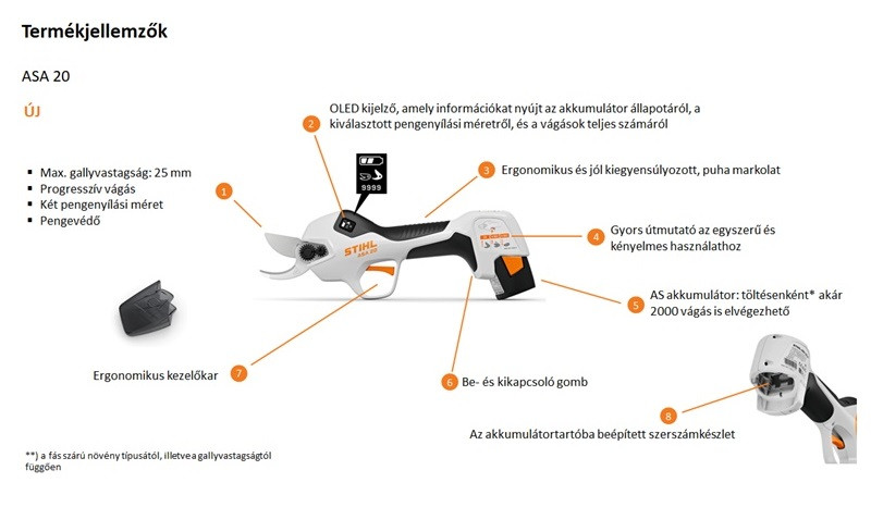 A STIHL ASA 20 akkumulátoros metszőolló akár 25 mm átmérőjű ágak levágására is alkalmas. Az ergonomikus kialakítású, kiváló egyensúlyú, puha markolat és a gép késrendszere kényelmes használatot tesznek lehetővé. Az ASA 20 késnyílása két fokozatban állítható. A jól látható LCD kijelző áttekintést nyújt az akkumulátor töltöttségi állapotáról, a beállított késszélességről és az elvégzett vágások mennyiségéről. A beépített szerszámokkal az egyszerű karbantartási munkák is elvégezhetők. A pengevédő segíti a gép biztonságos szállítását és tárolását.