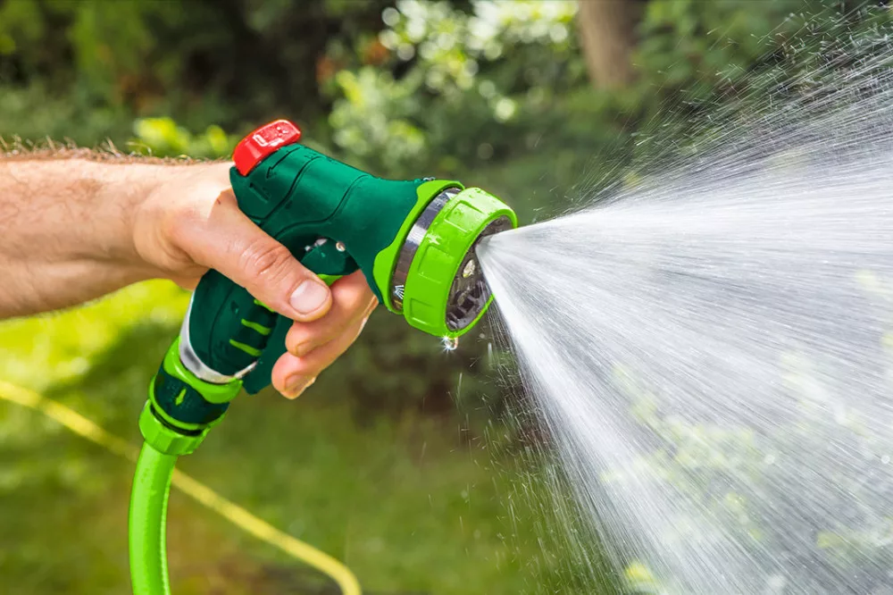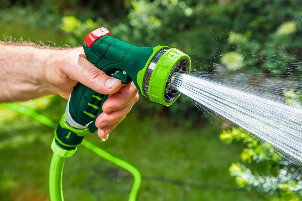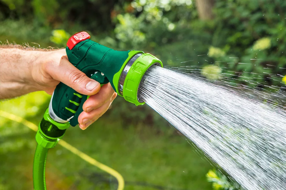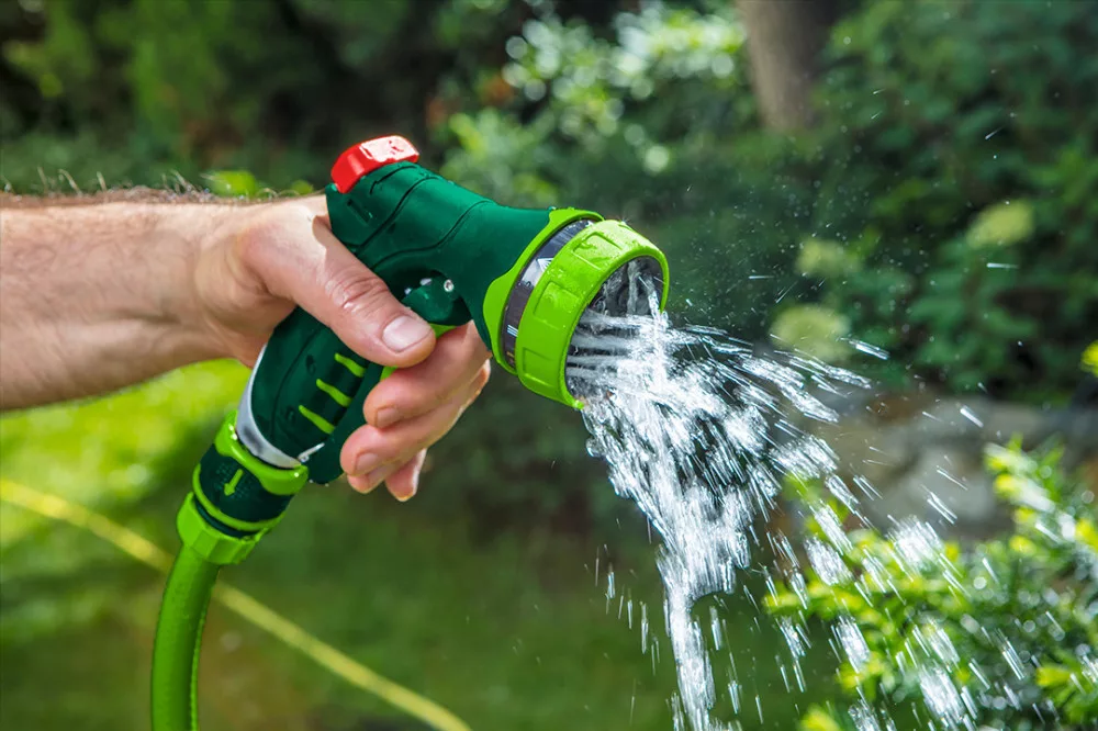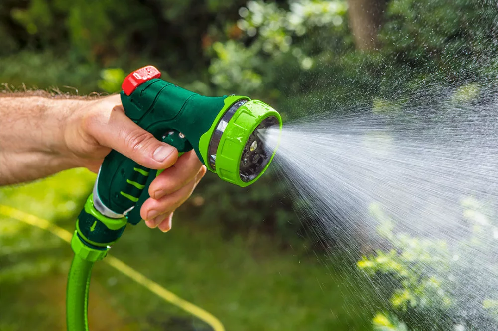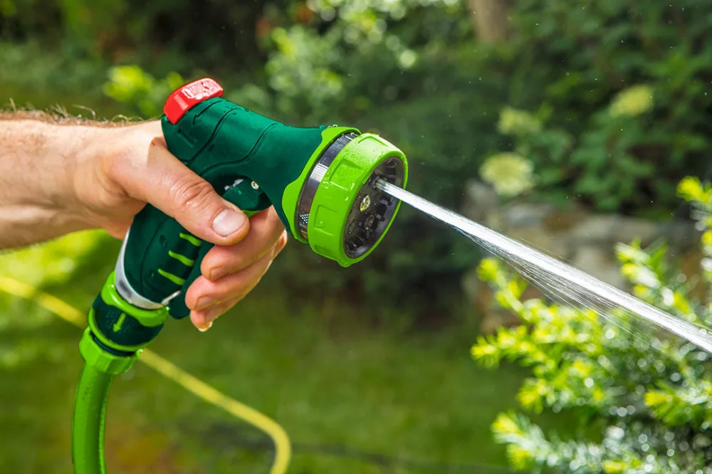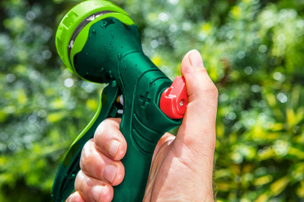Öntöző pisztoly 7 funkciós, különböző erősségű és funkciójú áramlás , áramlás olvasható jelölése, első reteszelő kar, dupla anyagú fogantyú