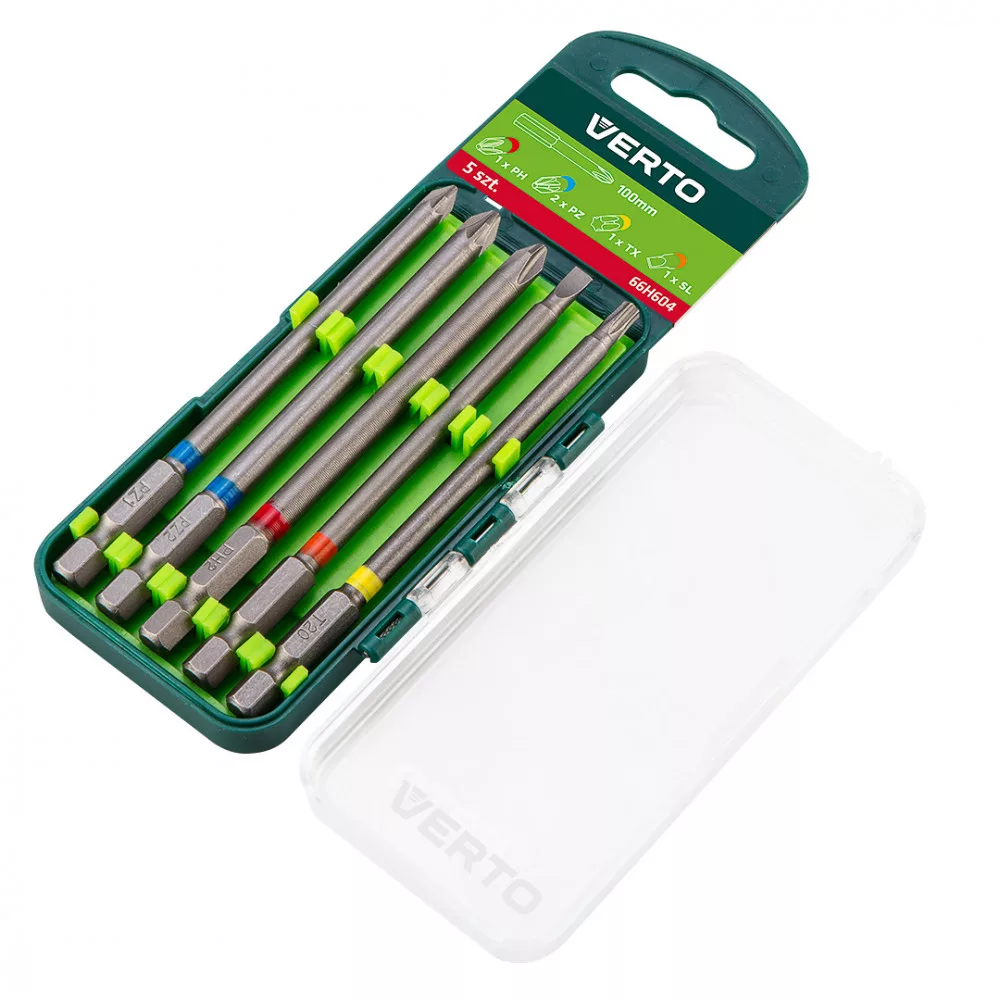 VERTO 66H604 Csavarhúzó Bitkészlet , 5 Db, 100Mm - 1 Xph, 2 Xpz, 1 Xsl, 1 Xtorx(Crv)