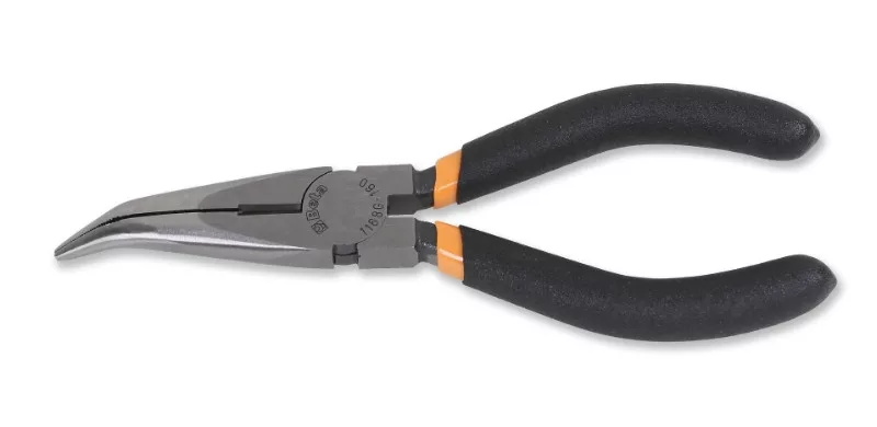 Hajlított extra hosszú félkerekcsőrű fogó, csúszásmentes kétrétegű PVC bevonatú markolat ipari kivitel