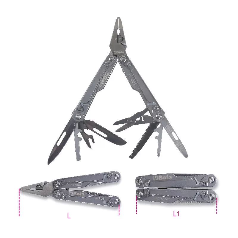 A BETA új multifunkciós szerszámának nyelén lévő négy karral a tartozékok minden helyzetből nyithatók, a két biztosítógomb pedig teljes biztonságot nyújt a felhasználónak.