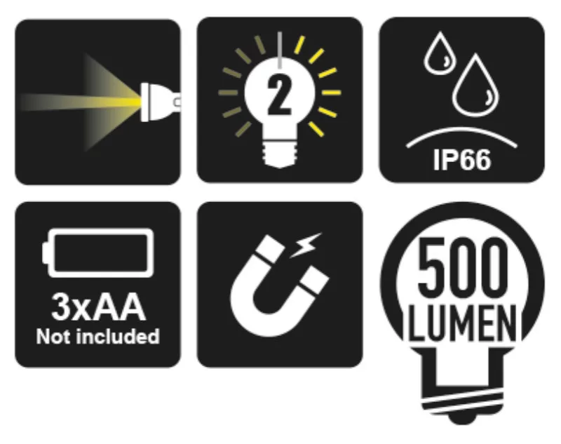 • állítható gyújtópont • 2 fényerősség beállítás • elemek: 3xAA (nem tartozék) • elem üzemidő: 14.5 óra • töltésjelző • IP66