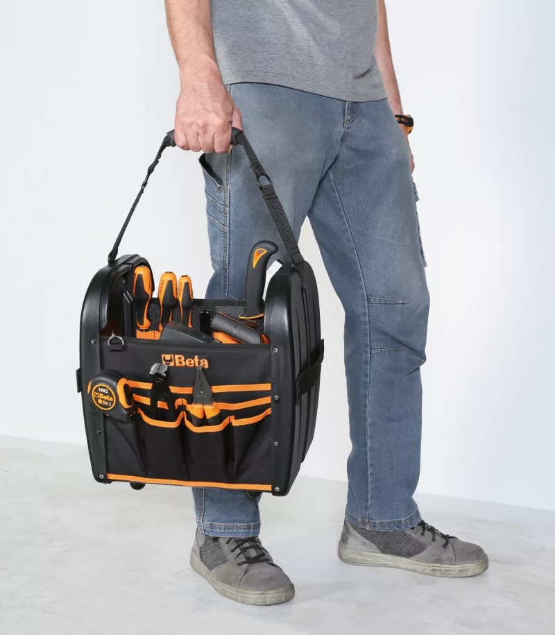 Kivehető belső szerszámpanel Gumis belső és külső zsebek szerszámok elhelyezésére Merev, vízhatlan, gumírozott fenéklap Vállszíjjal szállítva
