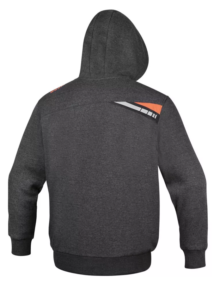 • 280 g/m2, 60% pamut, 40% poliészter • Rugalmas mandzsetták • Két nagy cipzáros zseb a derékrészen • Függőleges cipzáros zseb a mellrészen • Kapucni kerek zsinórral