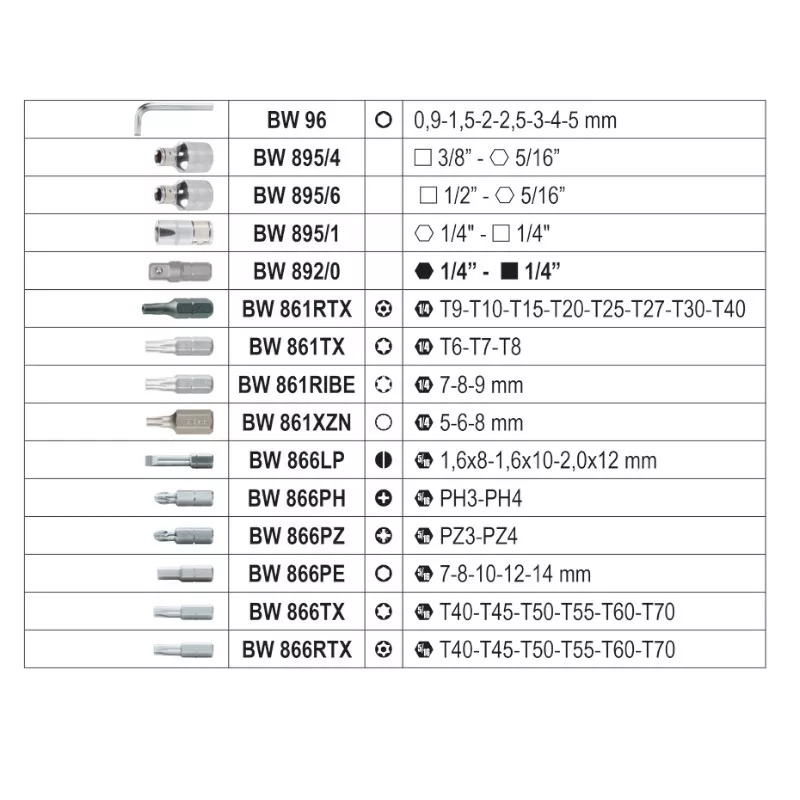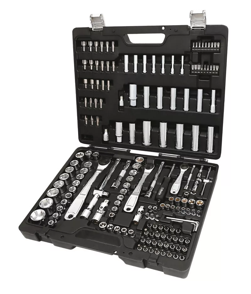 74 hatlapfejű dugókulcs, 42 csavarhúzóbetét, 30 csavarhúzó dugókulcs, 7 hajlított imbuszkulcs és 17 tartozék készlet műanyag dobozban