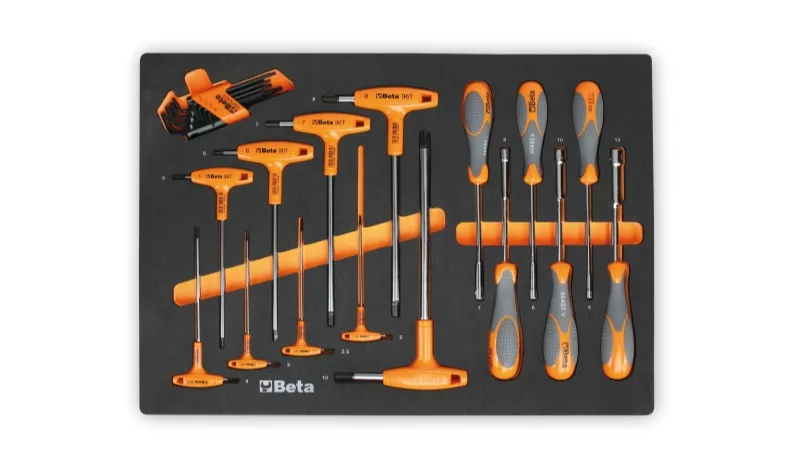 BETA MM60 EVA habszivacs tálca hajlított imbuszkulcsokkal és dugókulcsokkal Torx® csavarokhoz, nagy nyomatékot biztosító markolat (024580060)