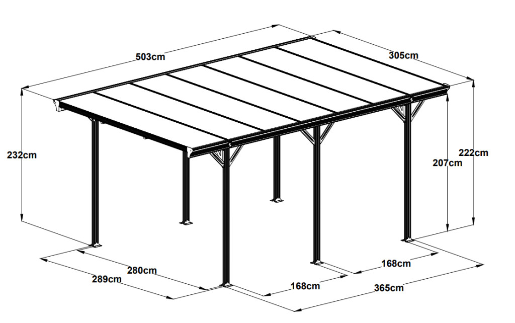 • A tágas, 15 m²-es (5×3 m) autóbeálló ideális megoldás jármű vagy egyéb kültéri felszerelés biztonságos lefedésére. Biztosítja a szükséges védelmet az eső, hó és napfény ellen.